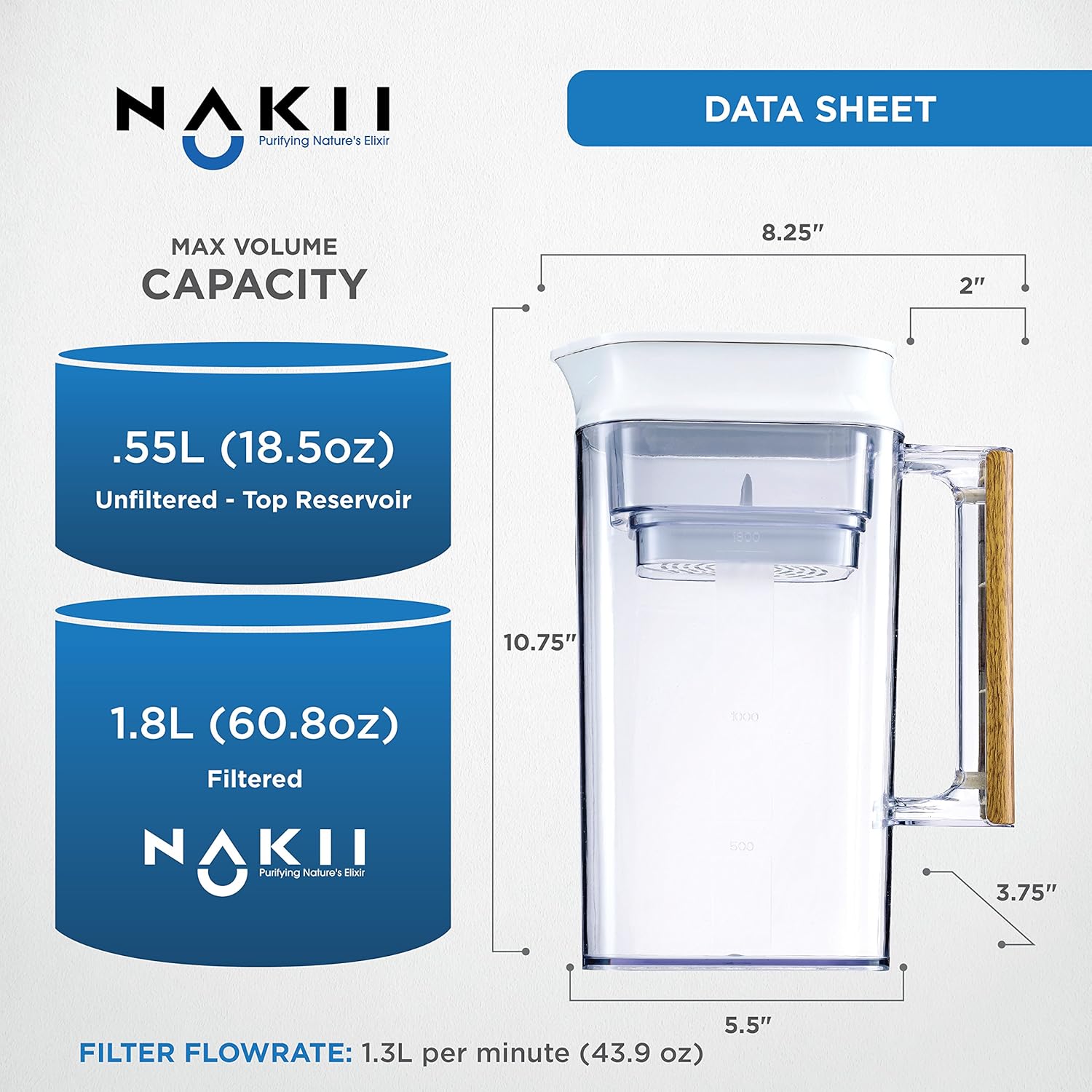 - TESTED AND CERTIFIED BY THE WQA! The Nakii brand water filter pitchers are manufactured by Water Innovations USA. They are certified by the WQA for NSF/ANSI 42 and NSF/ANSI/CAN 372, for High-Quality Filtration, chlorine taste, odor reduction, and lead-free compliance. The filter has a Life Span of 150 gallons, and a Fast Flow Rate of 1.3 liters per minute. This will give the best and Clearly Filtered Water for you and your family