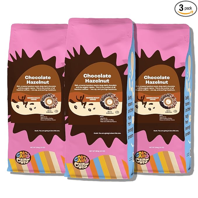 Crazy Cups Chocolate Hazelnut Ground Coffee, For Brewing Flavored Hot Or Iced Coffee, Medium Roast Flavored Coffee in 10 oz Bags, Pack of 3