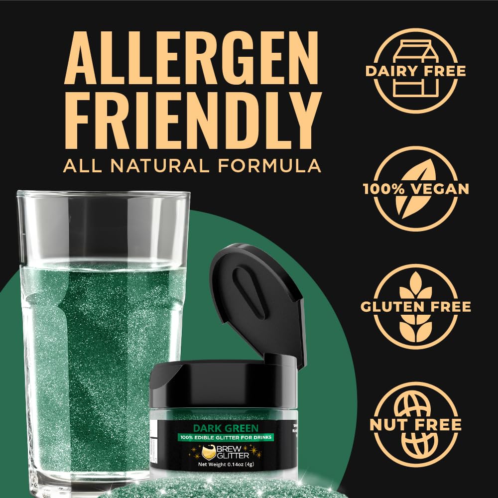- πΏ Brew Glitter dark green drink glitter is made in the USA at SQF III, GMP, Halal, and Kosher certified facilities, and is nut-free, gluten-free, and vegan.