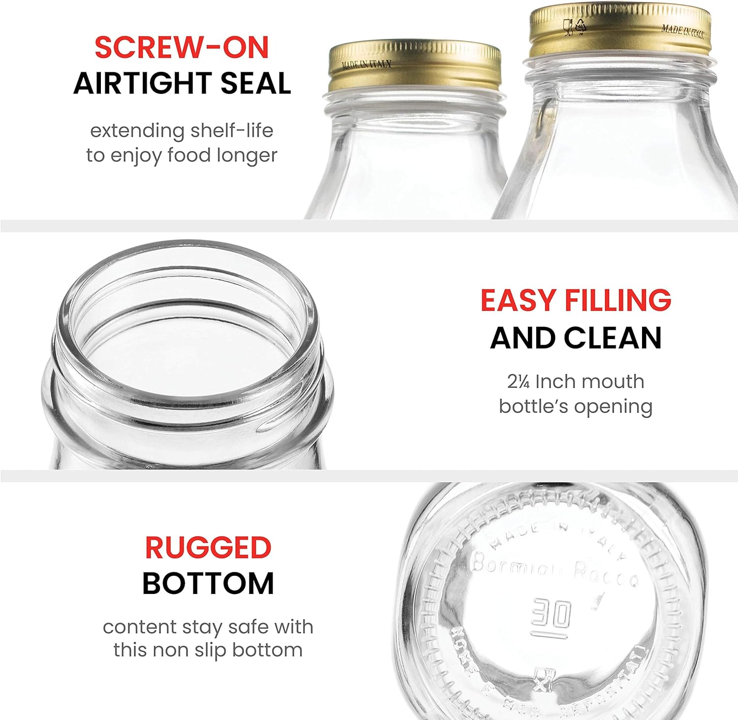 - Quality Italian Glass - Crafted in Italy using only the finest sands and materials by some of the best glassmakers in the world; these food grade bottles are made to last, easy to hand wash, and dishwasher safe.