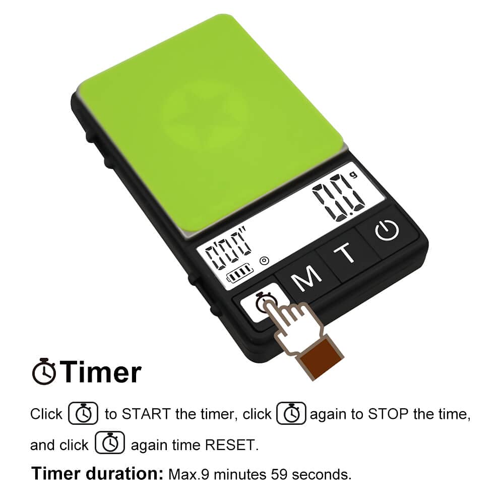 - INDEPENDENT TIMER: The barista coffee scale has a bulit-in timer (timer duration: Max. 9 minutes 59 seconds) and a high precision sensor. The timer function is nice for both pour over and espresso, it means you don't need to get out your other timing device while also watching the scale. HOW to USE TIMER? click timer key to start the timer, click again to stop the time, and click it again time reset