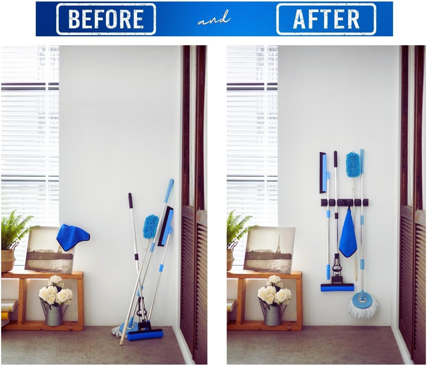 - This tool organizer wall mount declutters items off the floor at your home while lengthening the lifespan of your cleaning tools at the same time.