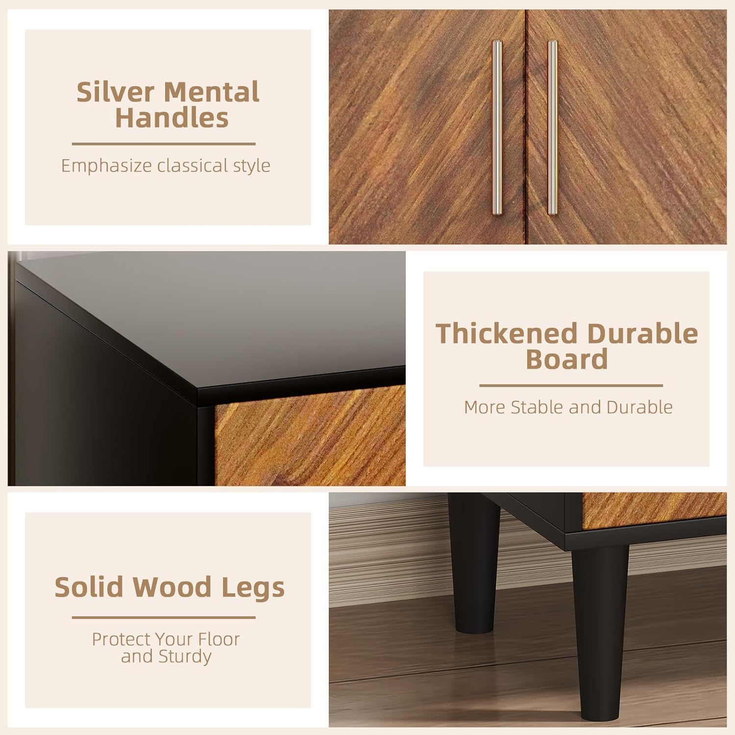 - Sleek Modern Design Elevates Any Room: With its rich wood grain doors and black frame, this modern buffet cabinet blends contemporary elegance with practicality—an eye-catching addition to any decor