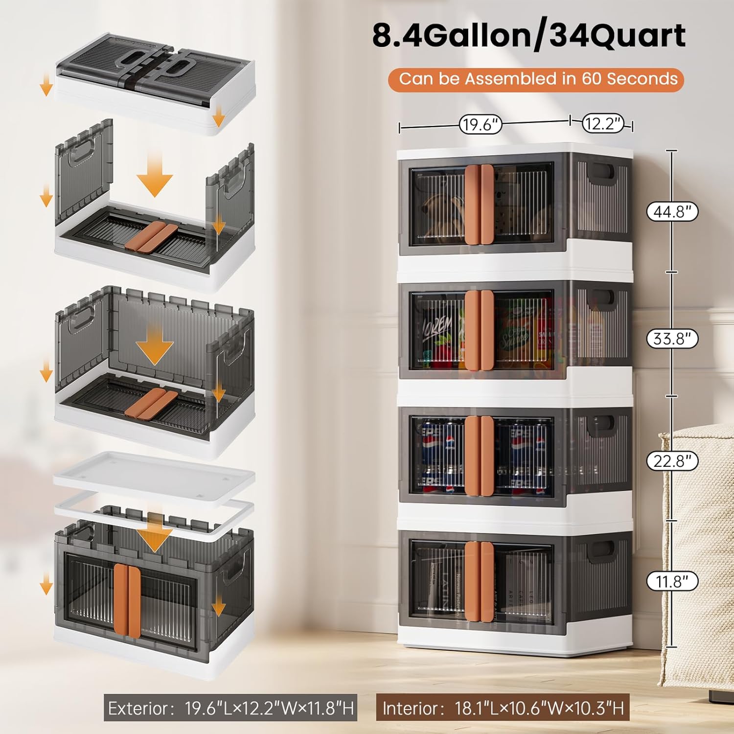 - Quick Assemble & Fold: Our storage containers can be assembled in 1 minute and folds down to 4 inches when not in use, easily tucking under beds/tight spaces—saves 80% of space. Heavy-duty PP plastic (2mm thick walls) supports 110 lbs (50 kg)/pack