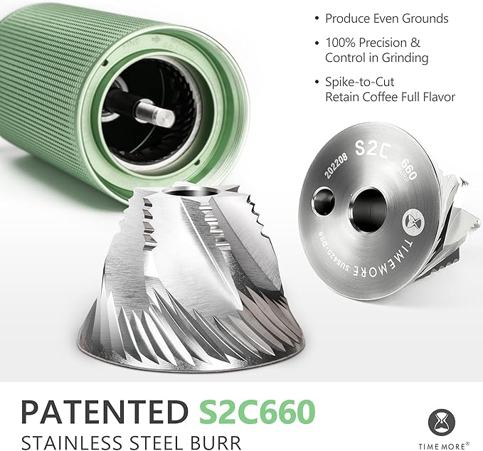 - S2C Patent Conical Burr: The TIMEMORE Manual Coffee Grinder is equipped with the revolutionary S2C patent conical burr. This advanced burr design ensures a consistent and even grind size, allowing for the perfect extraction of flavor from every bean. With its precision-engineered shape and cutting-edge material, the S2C burr provides exceptional grind uniformity and minimal heat generation during grinding, ensuring maximum flavor retention in every cup.