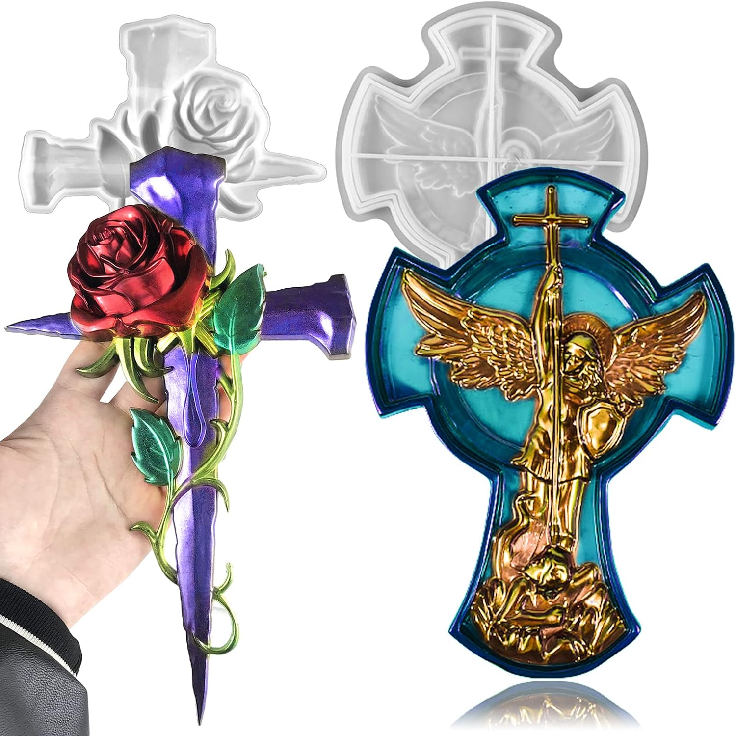 Wehous 2PCS Large Cross Resin Molds, 3D Silicone Resin Molds for Epoxy Casting, Cool Rose Cross Mold Angle Cross Tray Mold for Resin Clay Art Crafts Storage Wall Hanging Decor