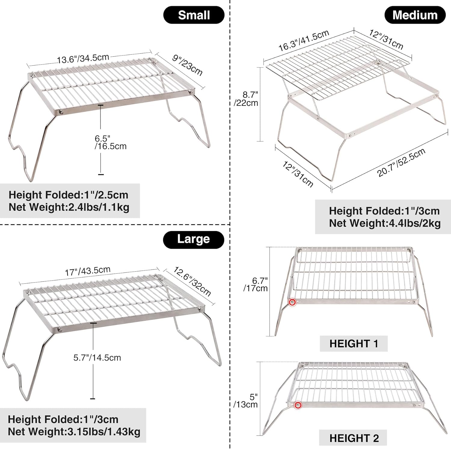 - 2 Heights Available:This foldable backpacker camping grill mesh has 2 holes on every side, this design provides us 2 heights available which are 6.3β/16cm and 4.7β/12cm. Choose different holes to adjust the height.
