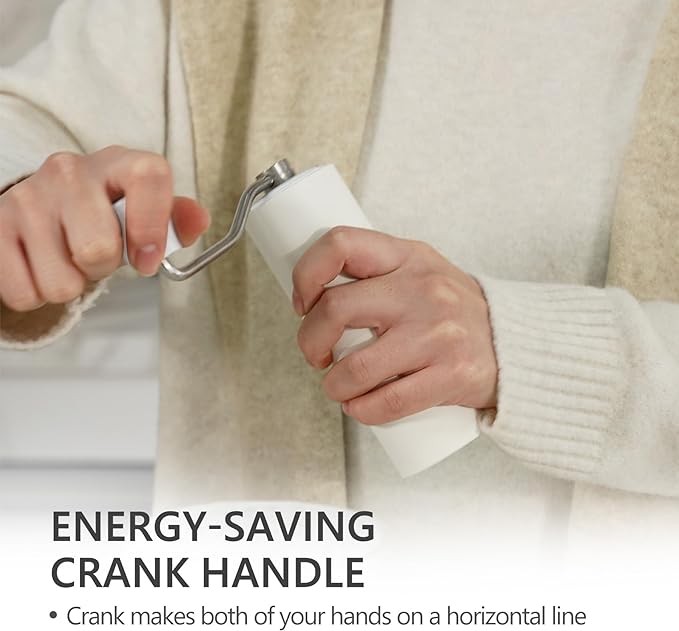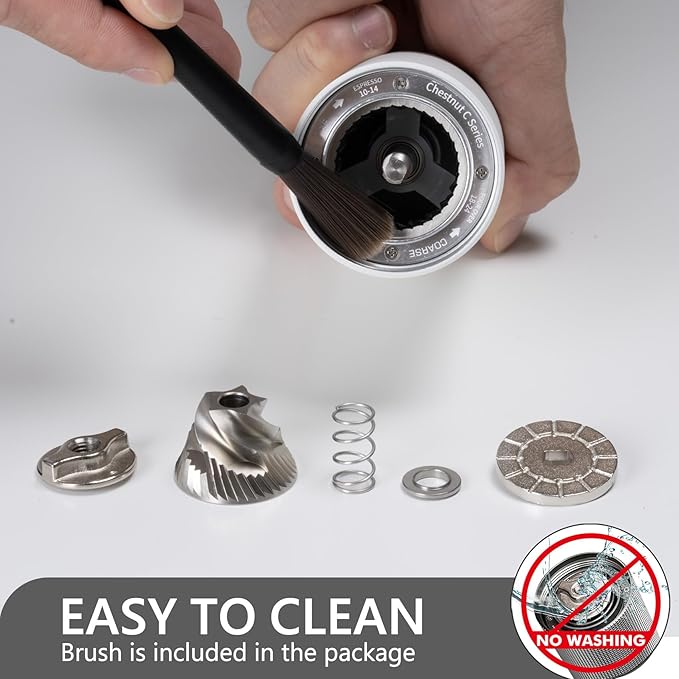 - [ Easy Clean & Carry ] Coffee grinder body weighs 700g, while maintaining a lightweight and a moderate sense of weight and luxury. It is ideal not only for home use but also for carrying outdoors or traveling. Easy to disassemble for cleaning - just be cleaned by brush.