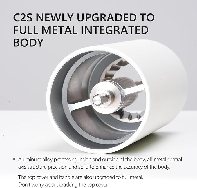 - [ Durable Manual Coffee Grinder ] TIMEMORE C2S hand coffee grinder upgraded to full metal unibody, It is made of CNC machining stainless steel conical burr. Double bearing central axis positioning-uniform grinding particles. Burr size 38 mm-efficient grinding of coffee beans