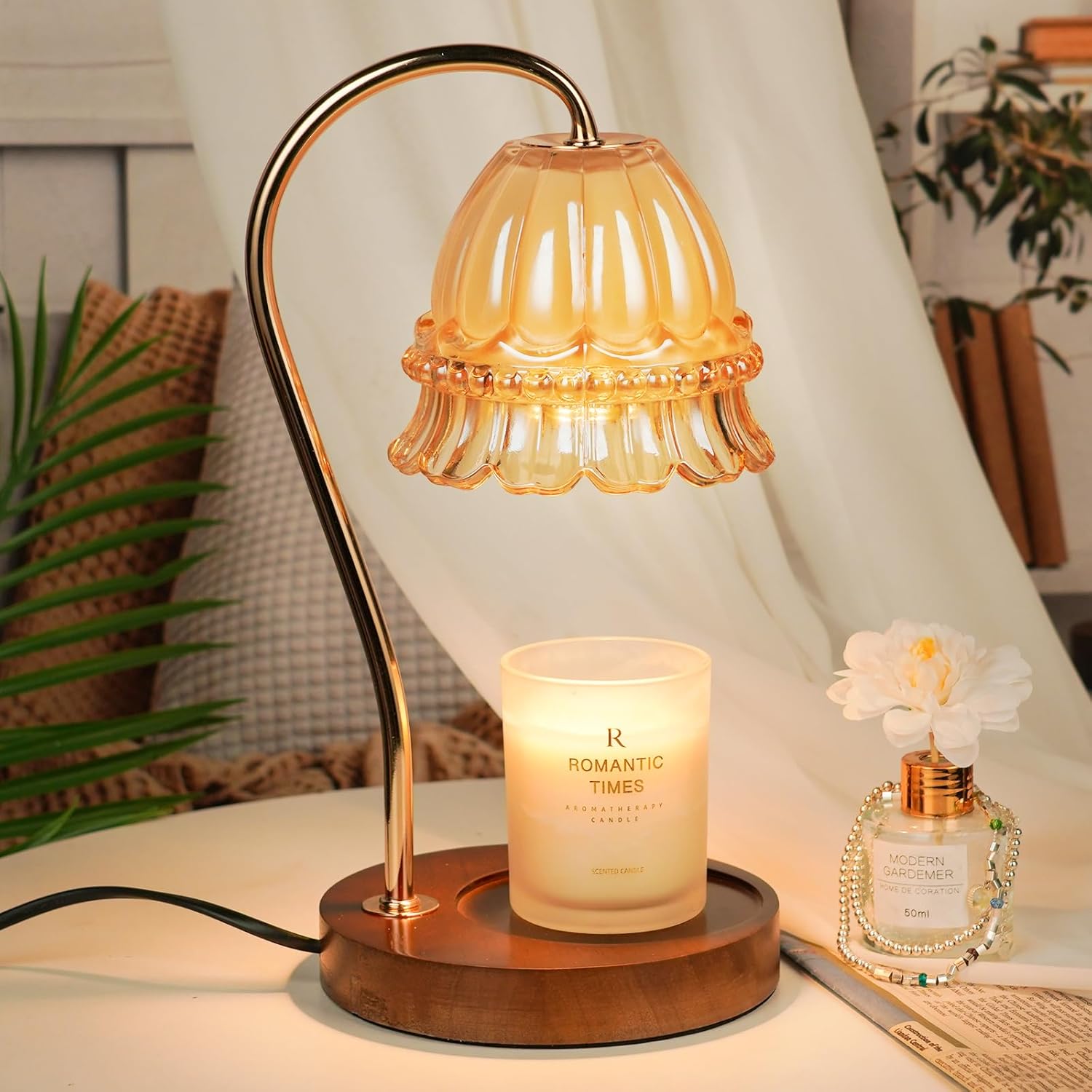 Glass Candle Warmer Lamp with Timer, Flower Candle Lamp, Birthday Gifts for Women, Mom, Female Friend, Candle Lamp Warmer Gifts, Electric Dimmable Candle Warmer, Vintage Home Decor, Amber