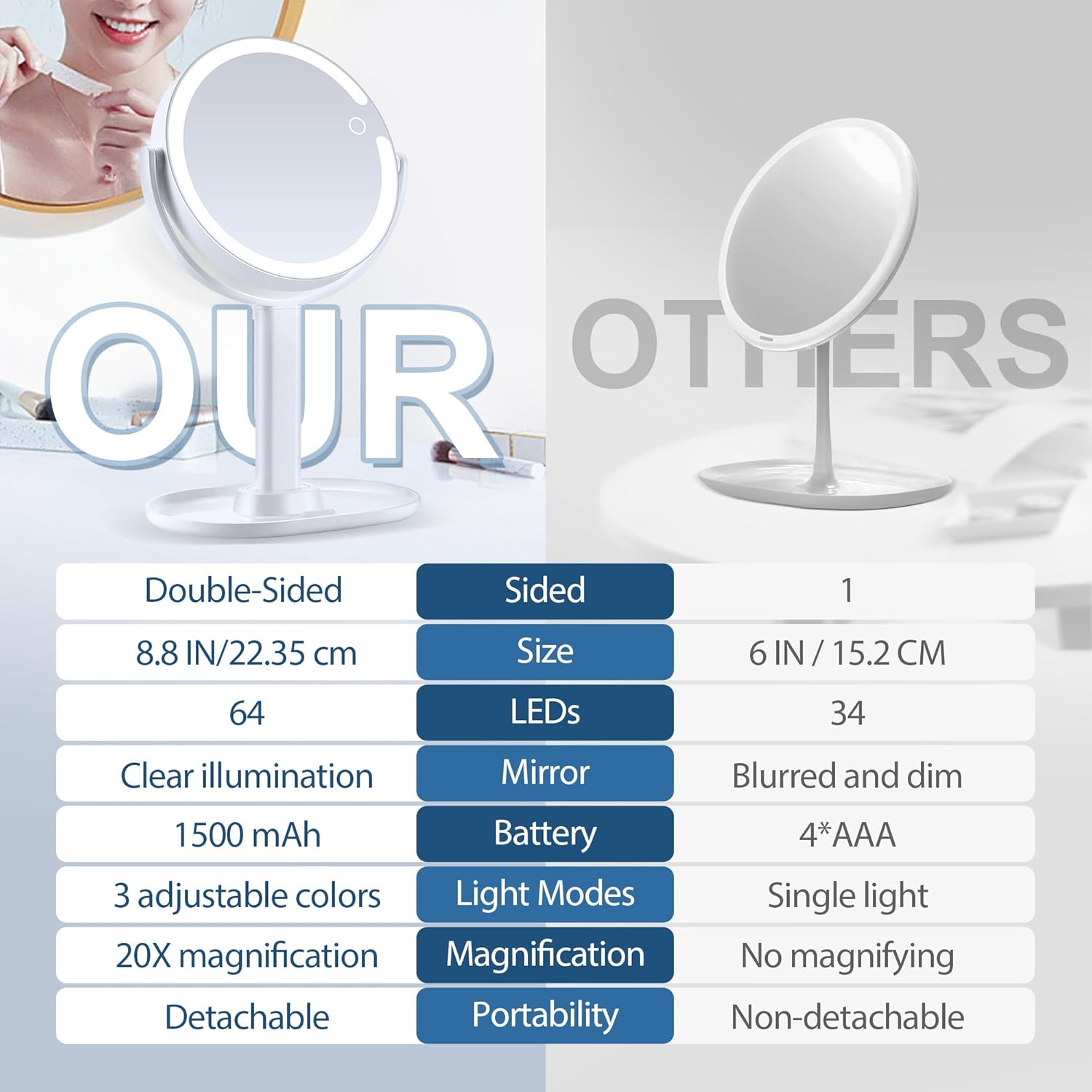 - Double Side with 20X/1X Magnification: This magnifying makeup mirror features a double-sided design with 20X and 1X magnification, as well as an oversized 8.8-inch mirror. The 1X HD mirror can accomplish major daily use, while the 20X magnifying mirror can assist with various fine makeup operations, such as putting on contacts, plucking eyebrows, and applying mascara.