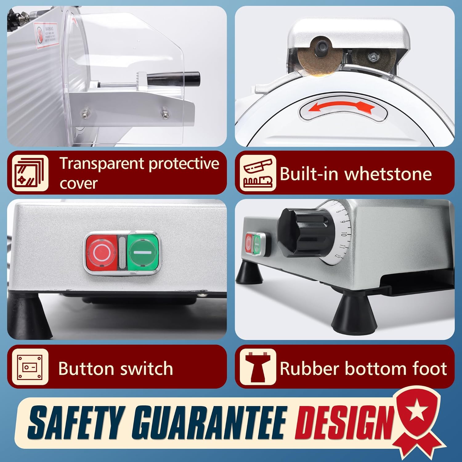 - Safety Protection Design: Our meat slicer is equipped with a knife sharpener, which can be safely sharpened without disassembly; A fixed transparent guard to prevent accidental contact with the blade. Push-button switches provide easy operation, and rubber soles are non-slip to ensure stability. The push bar and handle keep the food firmly in place