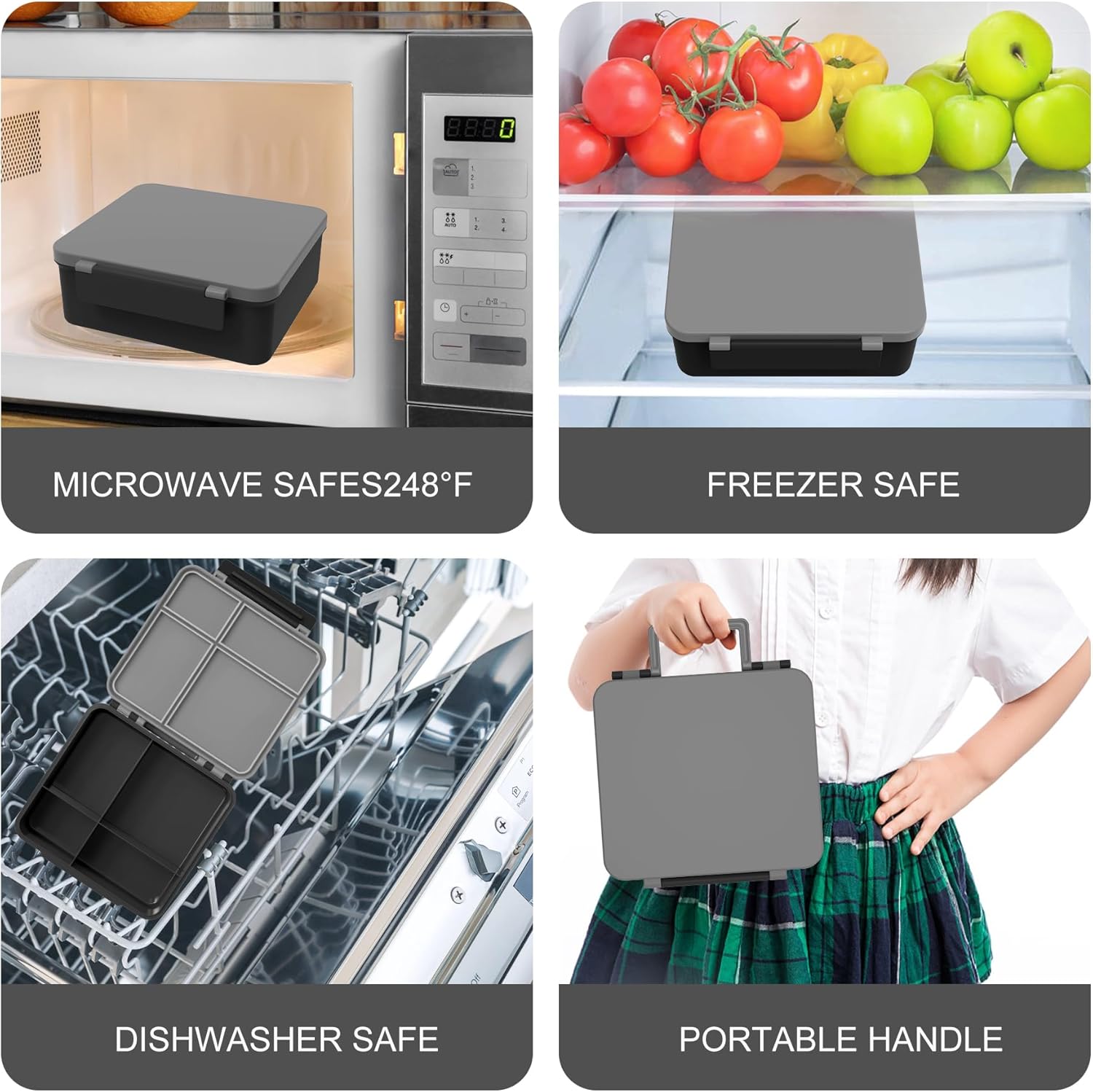 - Food Grade Materials: Our lunch boxes and insulated thermo food jar are made of food grade materials, which not only seal and prevent leakage, but also effectively prevent odors,Four sealed compartments can effectively prevent food from cross flavoring each other. food safety is the original intention of our product development.