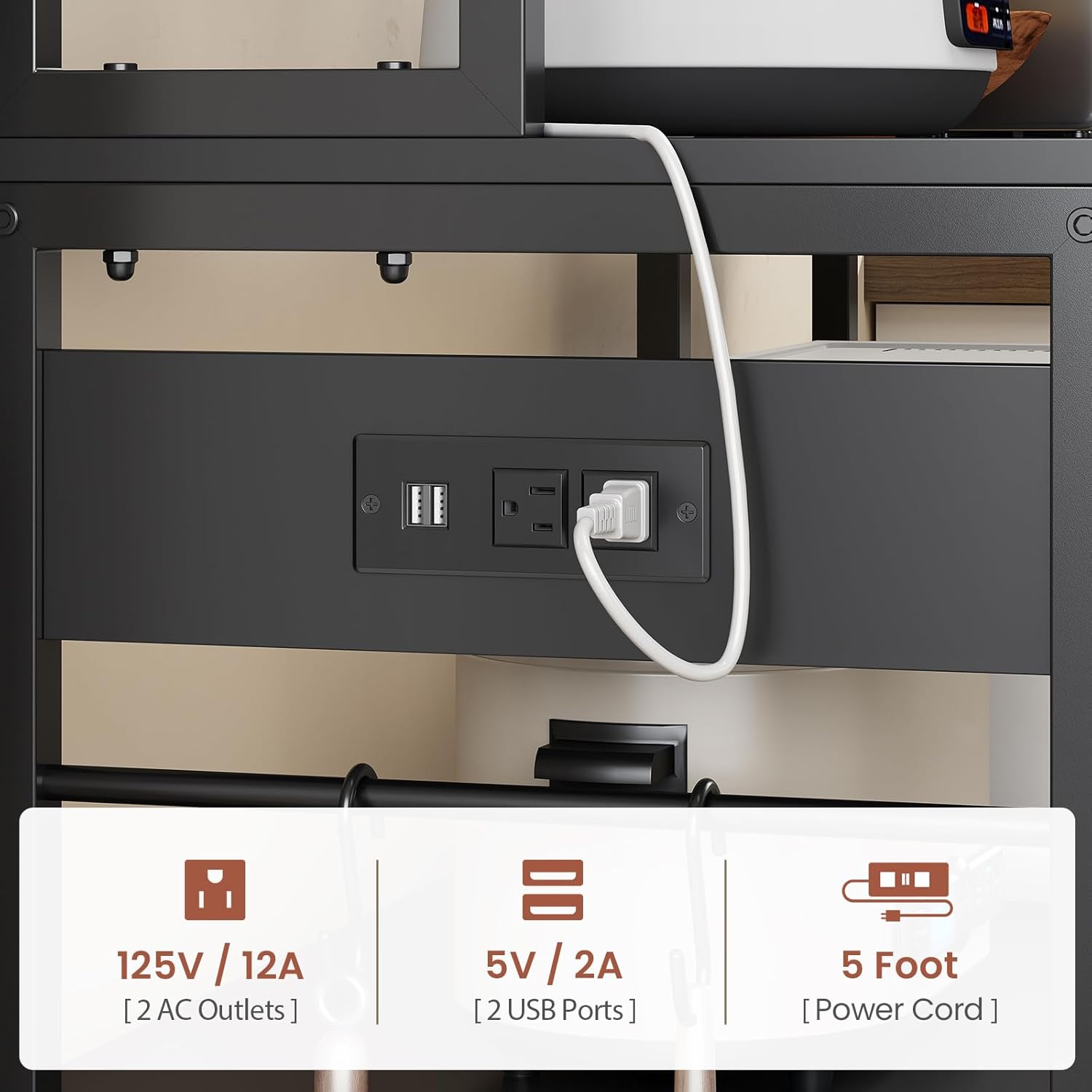- ăBakers Rack with Power OutletsăThis bakers rack is equipped with 2 AC outlets, 2 USB charging ports to provide power for up to 4 devices simultaneously. Our baker rack comes with the RGB LED light strip that can not only increase the atmosphere of the kitchen but also brighten the work area so that you can operate at night.