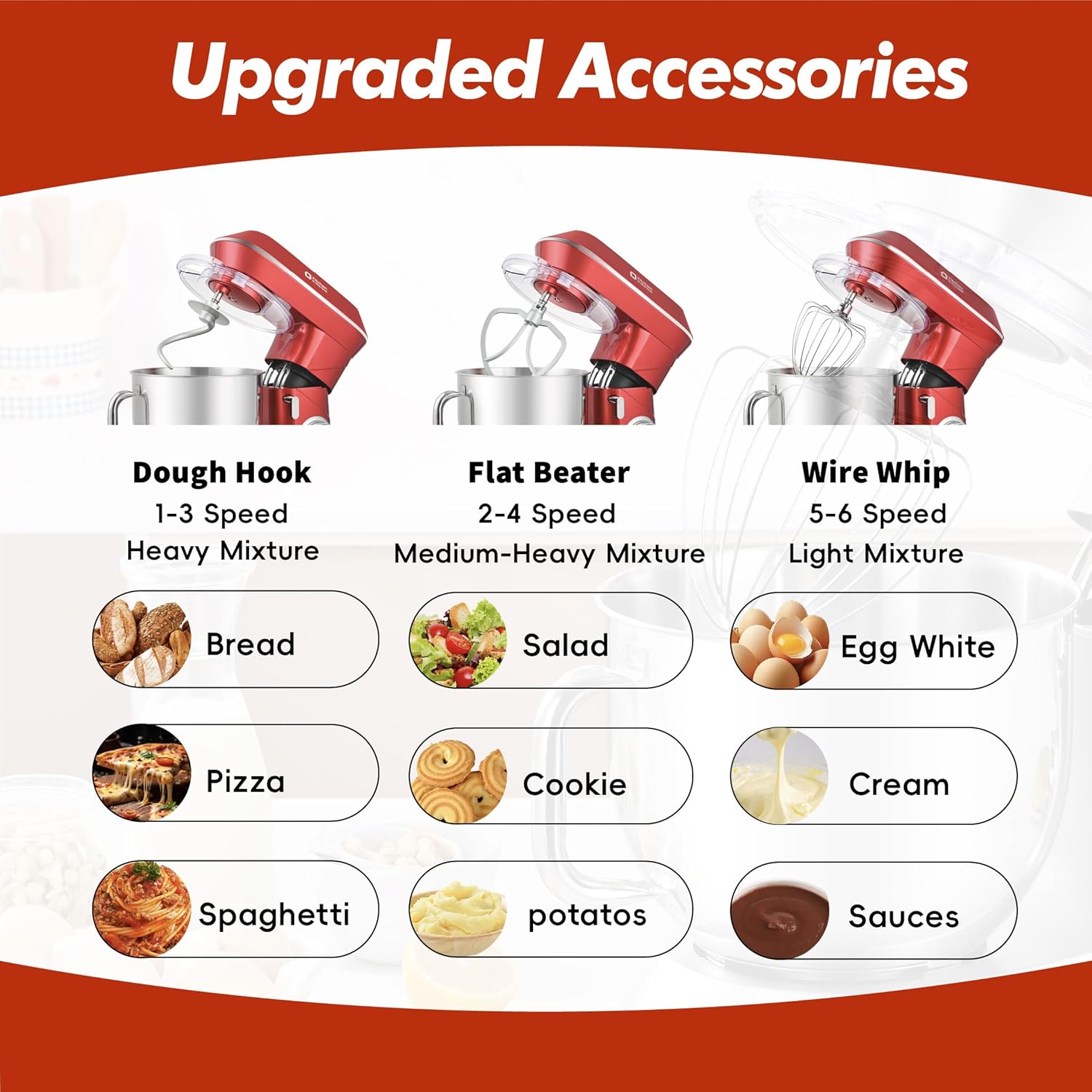 - 900W High Performance Motor: Our stand mixer is equipped with a 900W motor, upgraded motor has higher stirring efficiency and can fully mix all the ingredients in the bowl and easily complete the mixing of bread dough, thick batter and egg whites