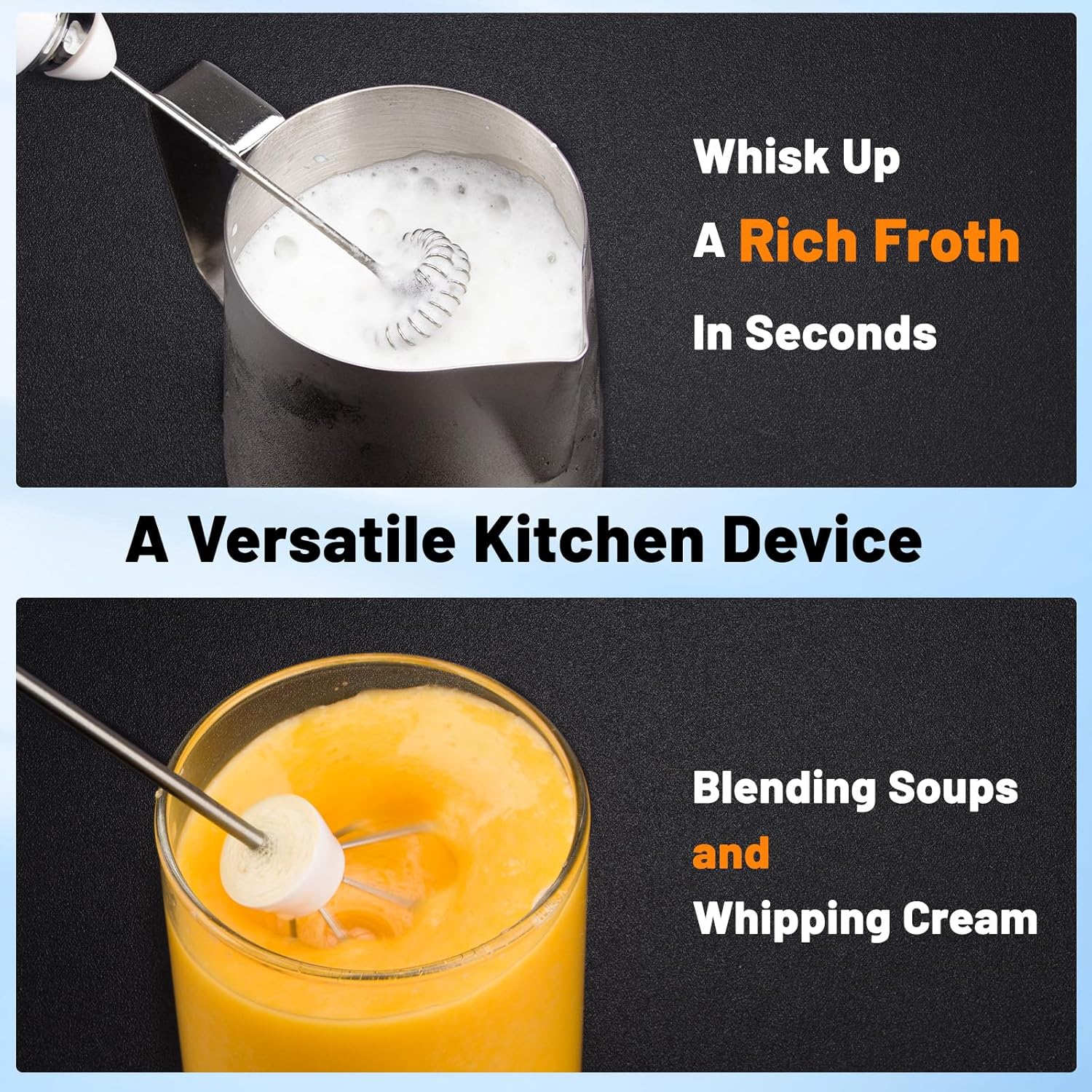- 【Double 304 Stainless Steel Whisks】: This handheld coffe frother come with 2 premium food-grade stainless steel whisk. One is great for Coffee, Latte, Milk, Hot Chocolate, Drinks, gives that professional finishing touch to your drinks. Another one is great for whisking egg, which is a good helper for baking in the kitchen.