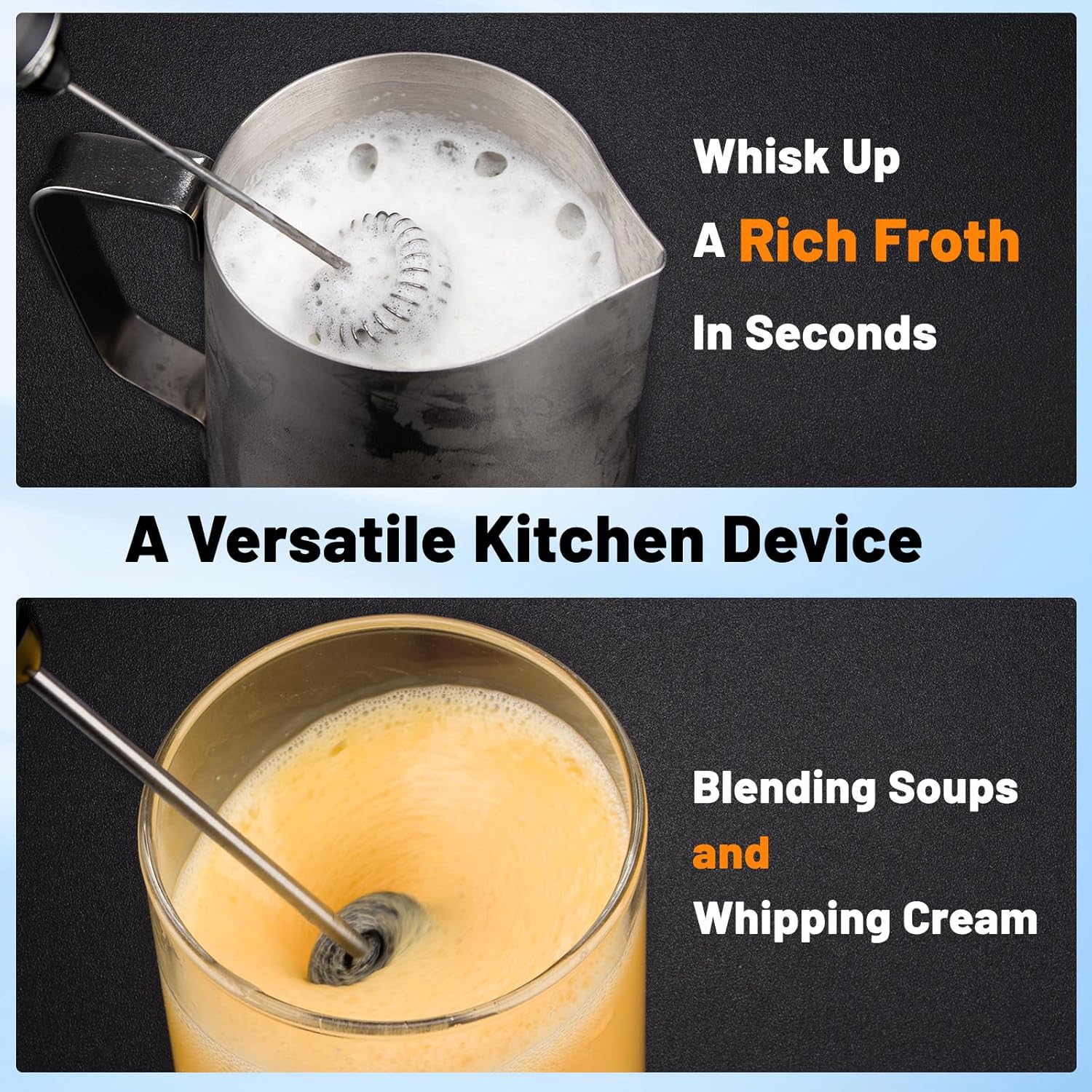 - 【Double 304 Stainless Steel Whisks】: This handheld coffe frother come with 2 premium food-grade stainless steel whisk. One is great for Coffee, Latte, Milk, Hot Chocolate, Drinks, gives that professional finishing touch to your drinks. Another one is great for whisking egg, which is a good helper for baking in the kitchen.