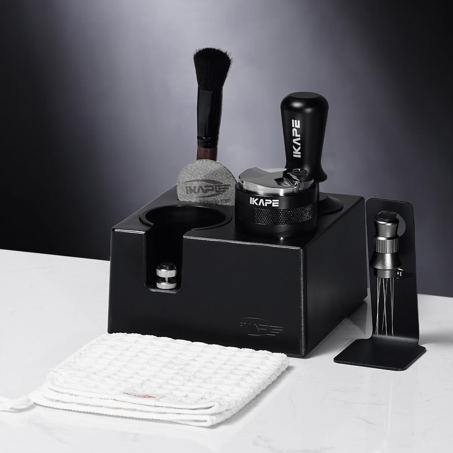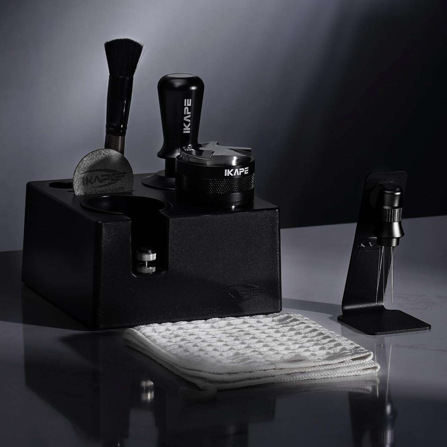 IKAPE 53MM Black Espresso Tool Set 8 IN 1, Coffee Tamper, Distributor, Magnetic Funnel, Puck Screen, Tamper Station, Stirrer Distribution Tool, Cleaning Towel and Brush