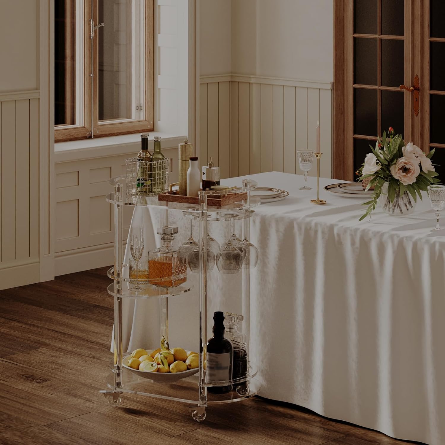 - Modern & Stylish Design: Transparent cart with rotating glass holders, modern and sophisticated. Sleek staggered layout design, suitable for various decoration styles and different cccasions.