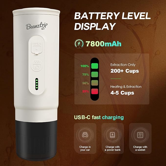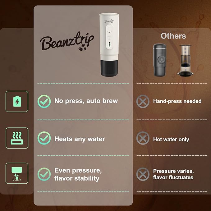- Ultra-Light & Compact: At just 1.4 lbs and 2.8 x 2.8 x 9.1 inches, Beanztrip portable mini espresso machine easily fits in a backpack and fits car cup holders effortlessly, perfect for travel, camping, or office use—espresso anytime, anywhere!