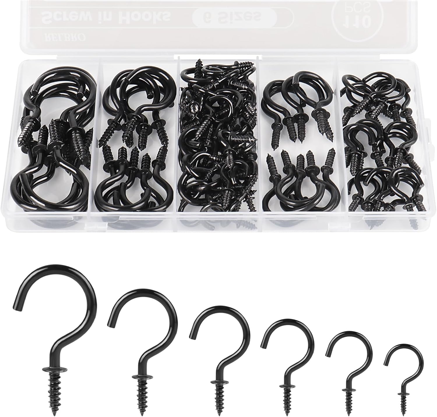 RELBRO Screw Hooks, 6 Sizes Metal Screw in Cup Hooks, 1/2 Inch, 5/8 Inch, 3/4 Inch, 7/8 Inch, 1 Inch, 1-1/4 Inch, Black, 110 Pcs