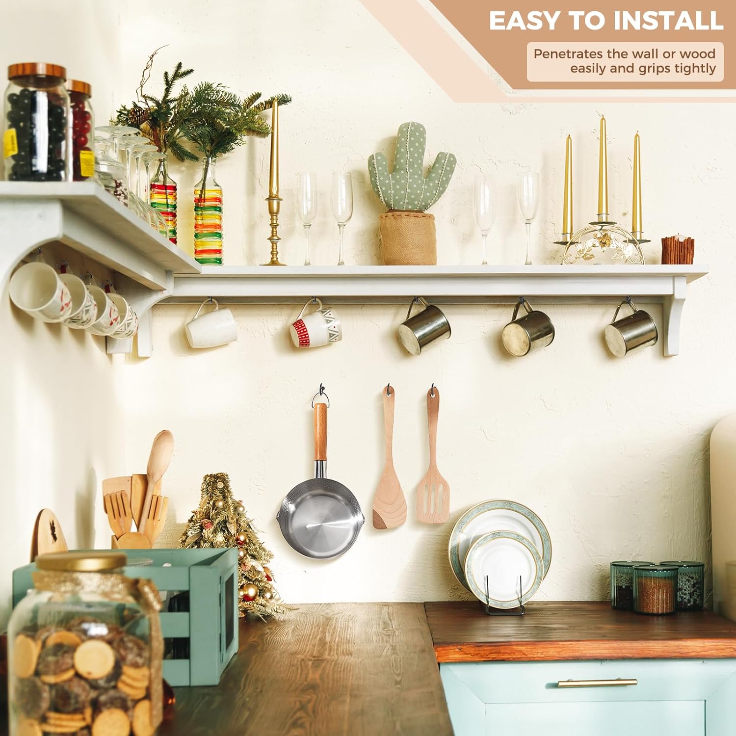 - Wide Application: Cup hooks screw in works for hanging items and organizing space, reduce clutter around the house, like kitchen, cabinet, closet, frame, fireplace, porch, fence, pergola, gutter, patio, garden, garage, office, camper; simple hooks for random items, meet different hanging needs