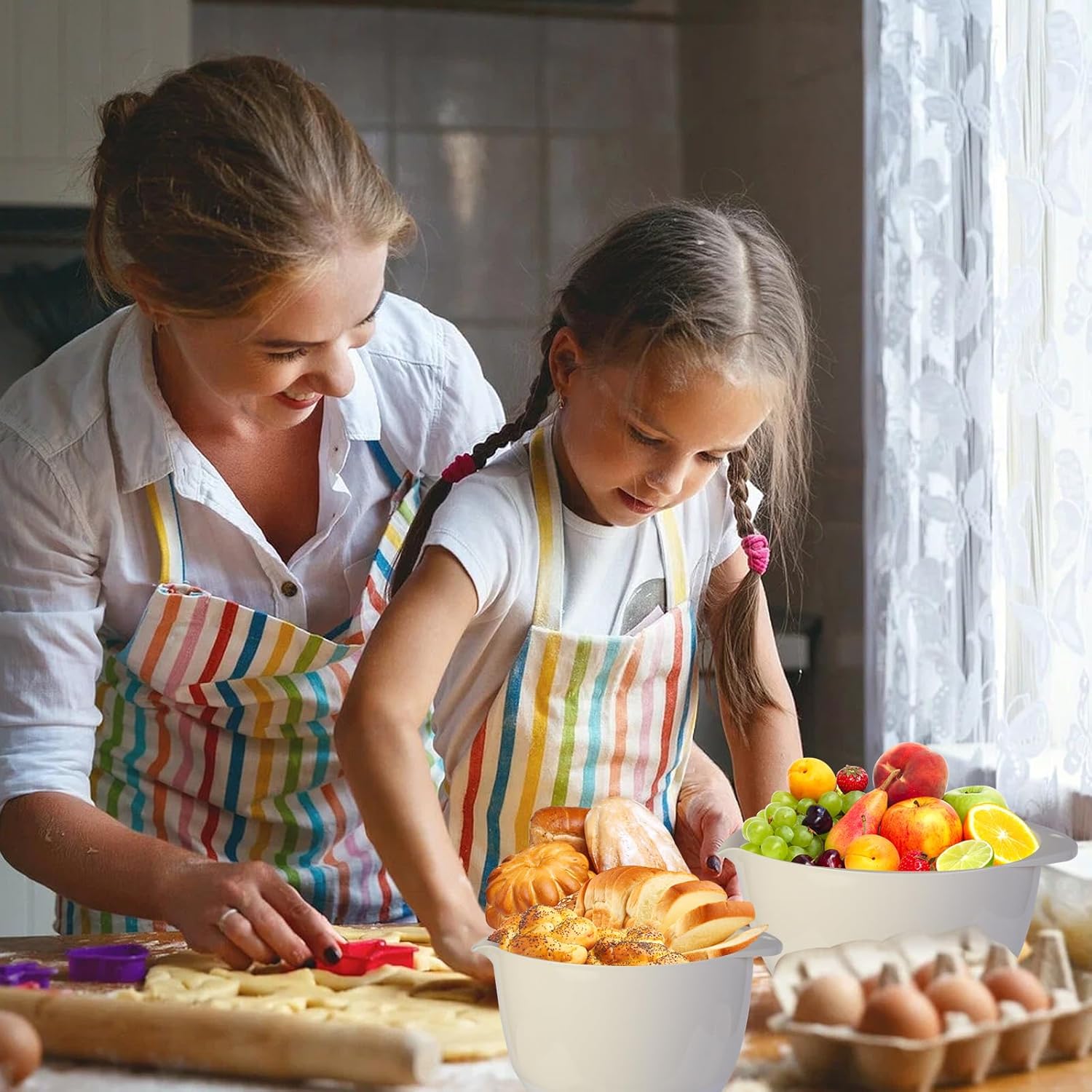 - 3 Pcs MIXING BOWL SET :These plastic mixing bowls with lids have 3 different sizes,meet your different needs.The large mixing bowl works perfectly for mixing things either by hand or when using a blender ,you can easily do cookie mix, or made cake batter, thick gingerbread dough, almond milk, persimmon cake.... the medium bowl uses to mix homemade spices together.the smaller bowl to hold prepped veggies,fruits.