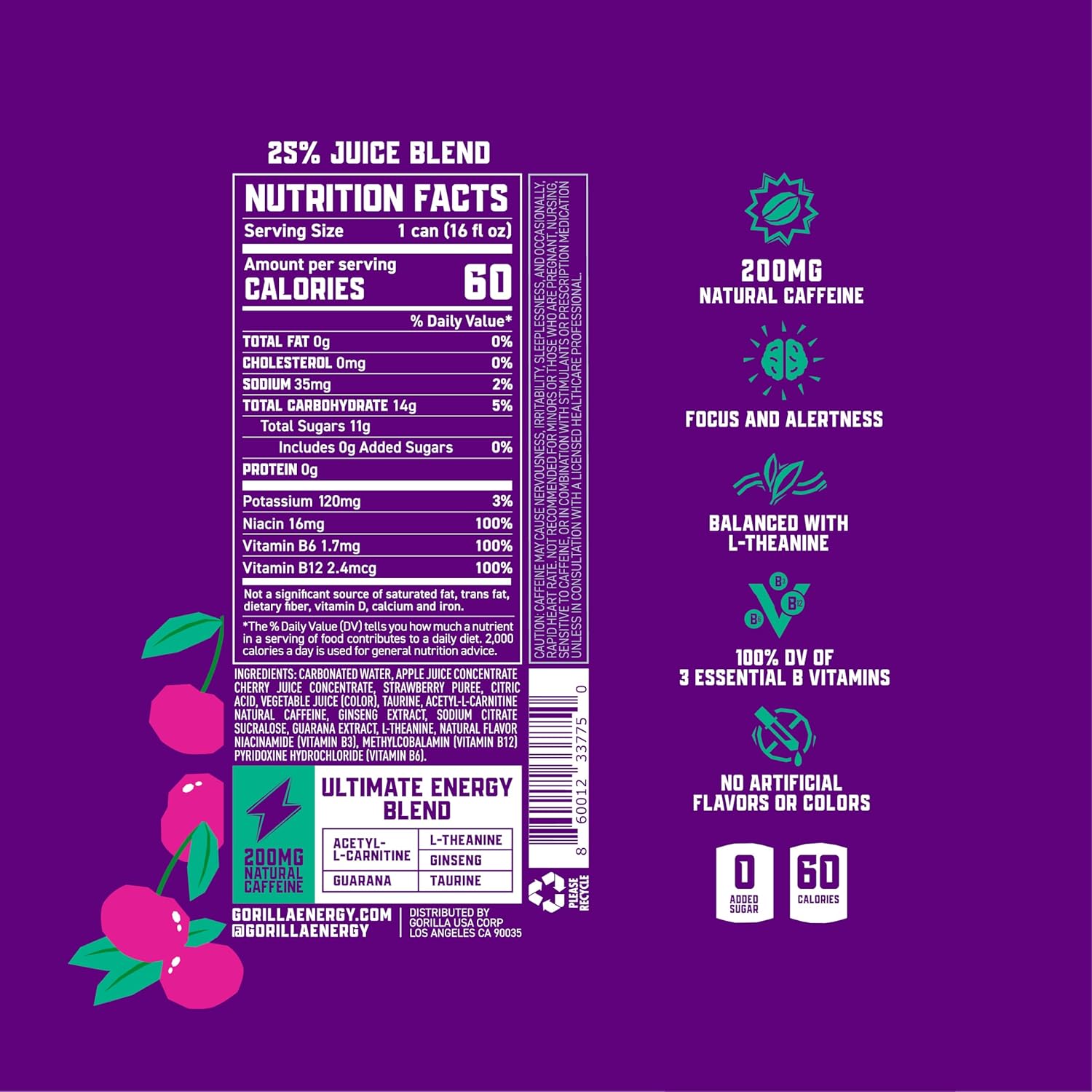 Gorilla Energy Drink, Cherry Berry, 200mg Natural Caffeine, Real Fruit Juice Squeezed & Concentrated, L-Theanine, Taurine, Ginseng, Acetyl L-Carnitine, No Added Sugar and No Artificial Colors, 12 Pack