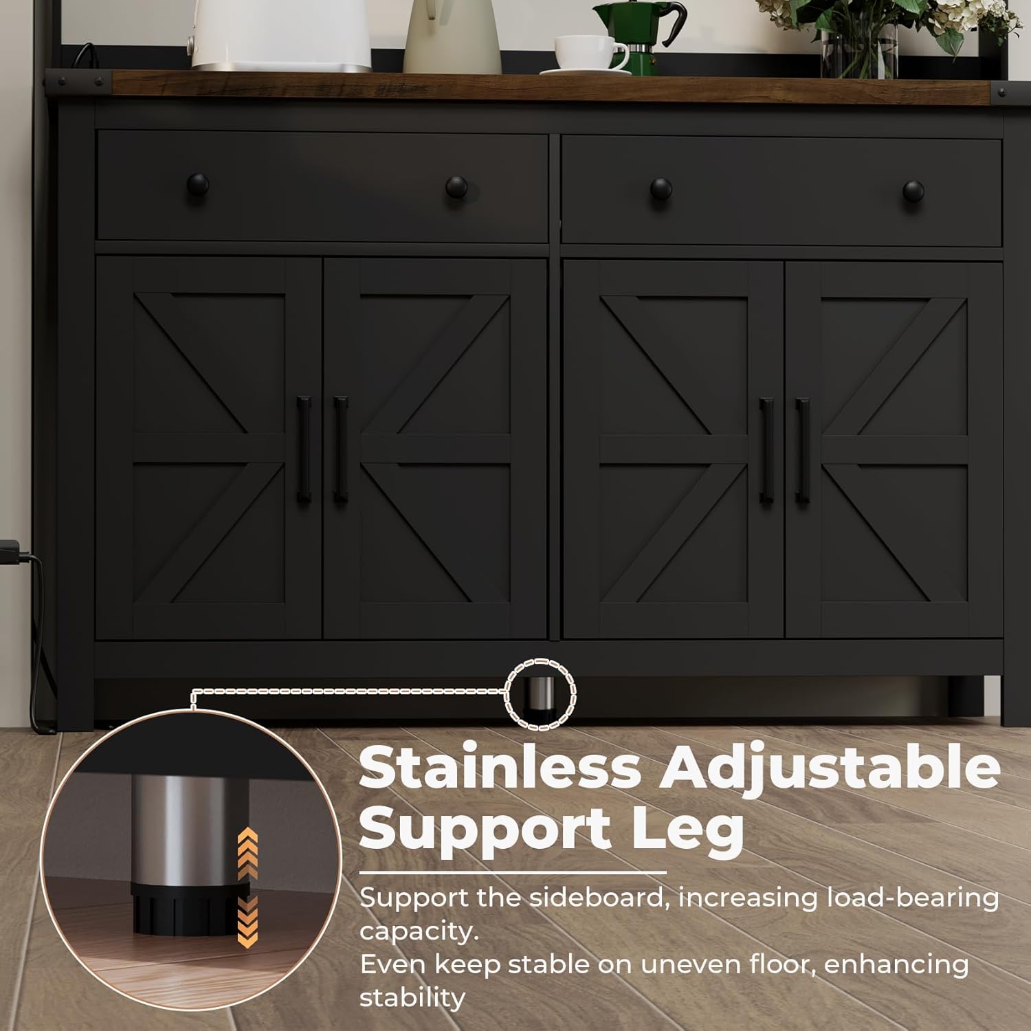 - 【Better Wood】Thicker and Denser Wood. The coffee bar cabinet with 2 drawers and 4 barn doors is made from thicker MDF wood.The material with higher density is sturdier and smoother, largely reducing the likelihood of scratching, peeling and cracking.