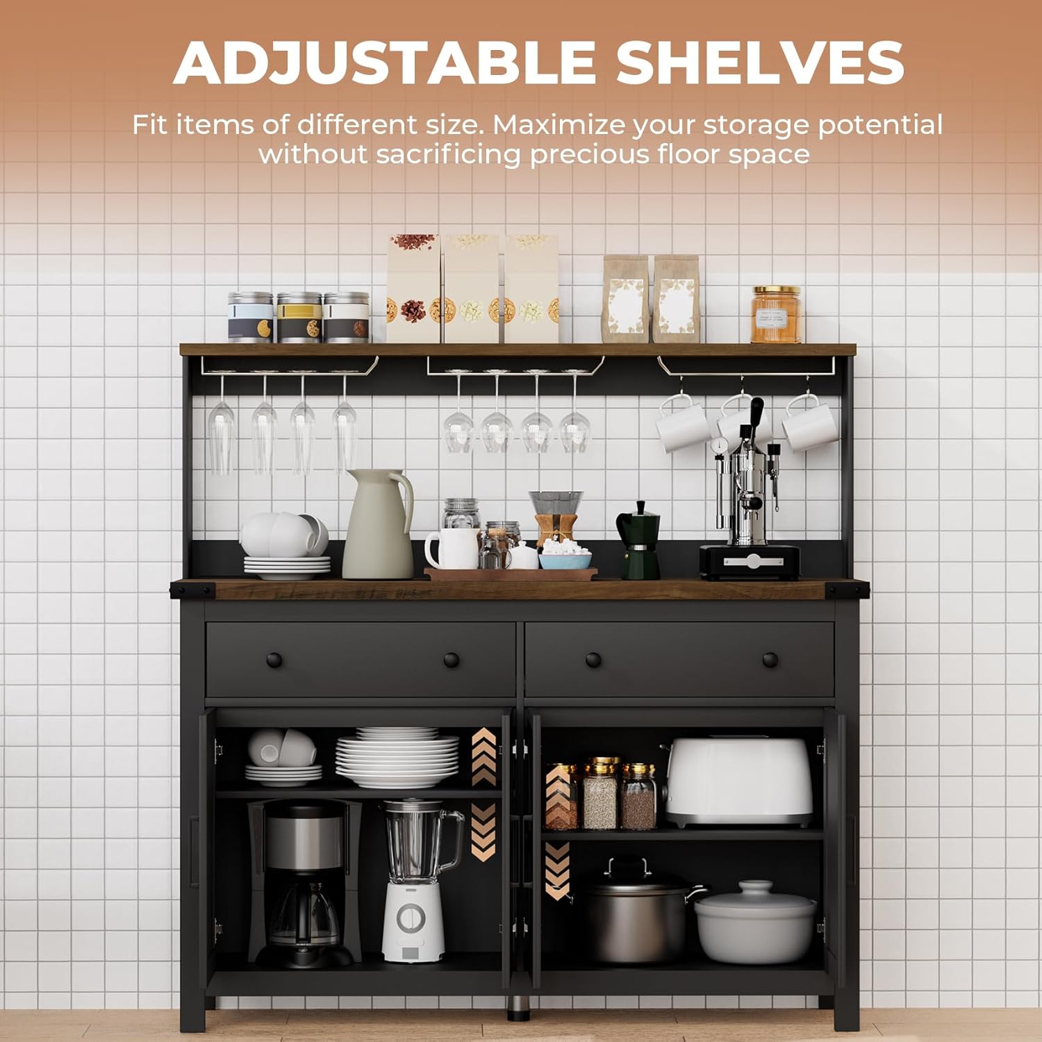 - 【Large Divided Storage】Say goodbye to clutter. The spacious countertop can accommodate coffee makers or microwave ovens. The adjustable shelves with doors allow you to personalize the height of shelves, no longer worrying about "too tall to put in". The drawers of the coffee bar cabinet make your essentials close to hand.Convenient sideboard buffet cabinet. Your wine glasses find their place in the wine holder.
