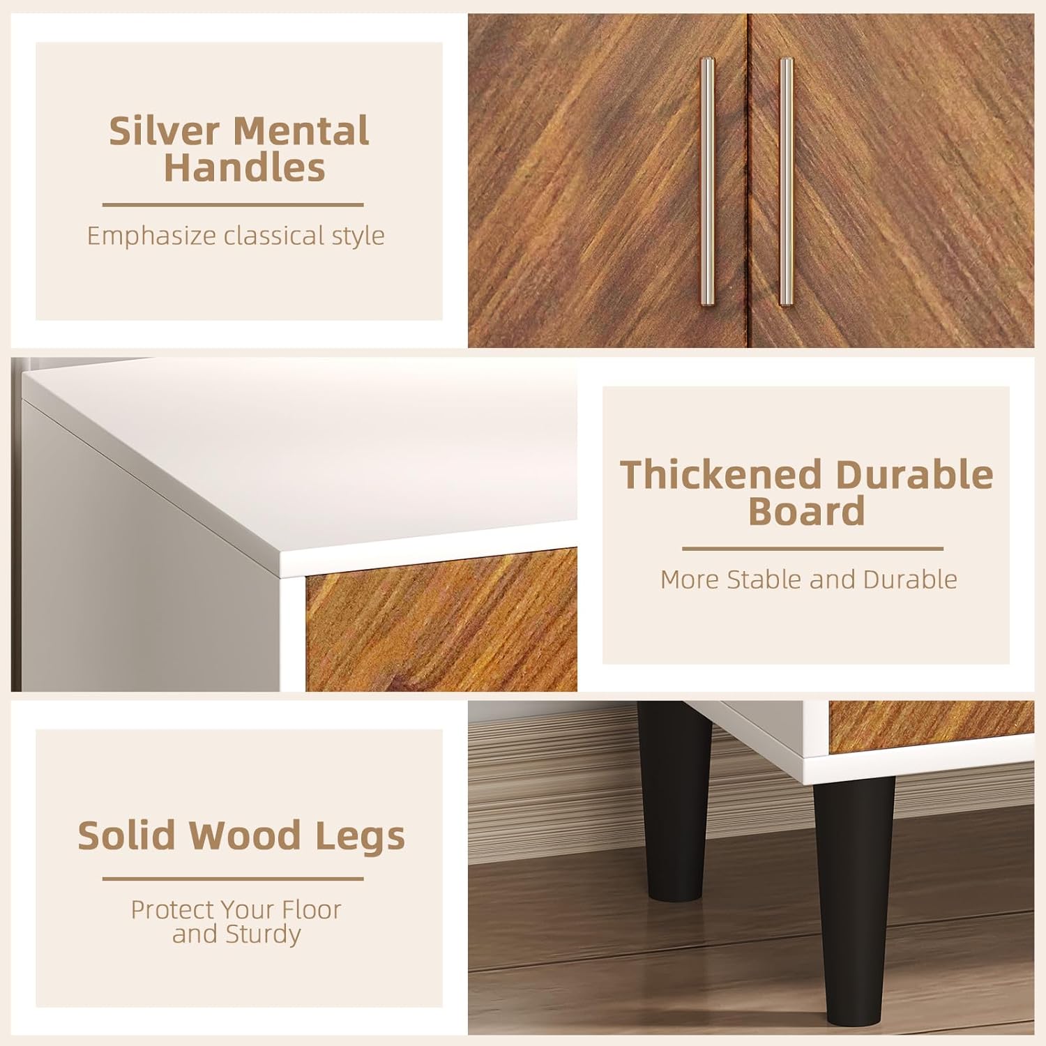 - Mid-century Modern Design: With its rich wood grain doors and white frame, this buffet cabinet blends contemporary elegance with practicality—an eye-catching addition to any decor. The silver handles reflect the side board modern style