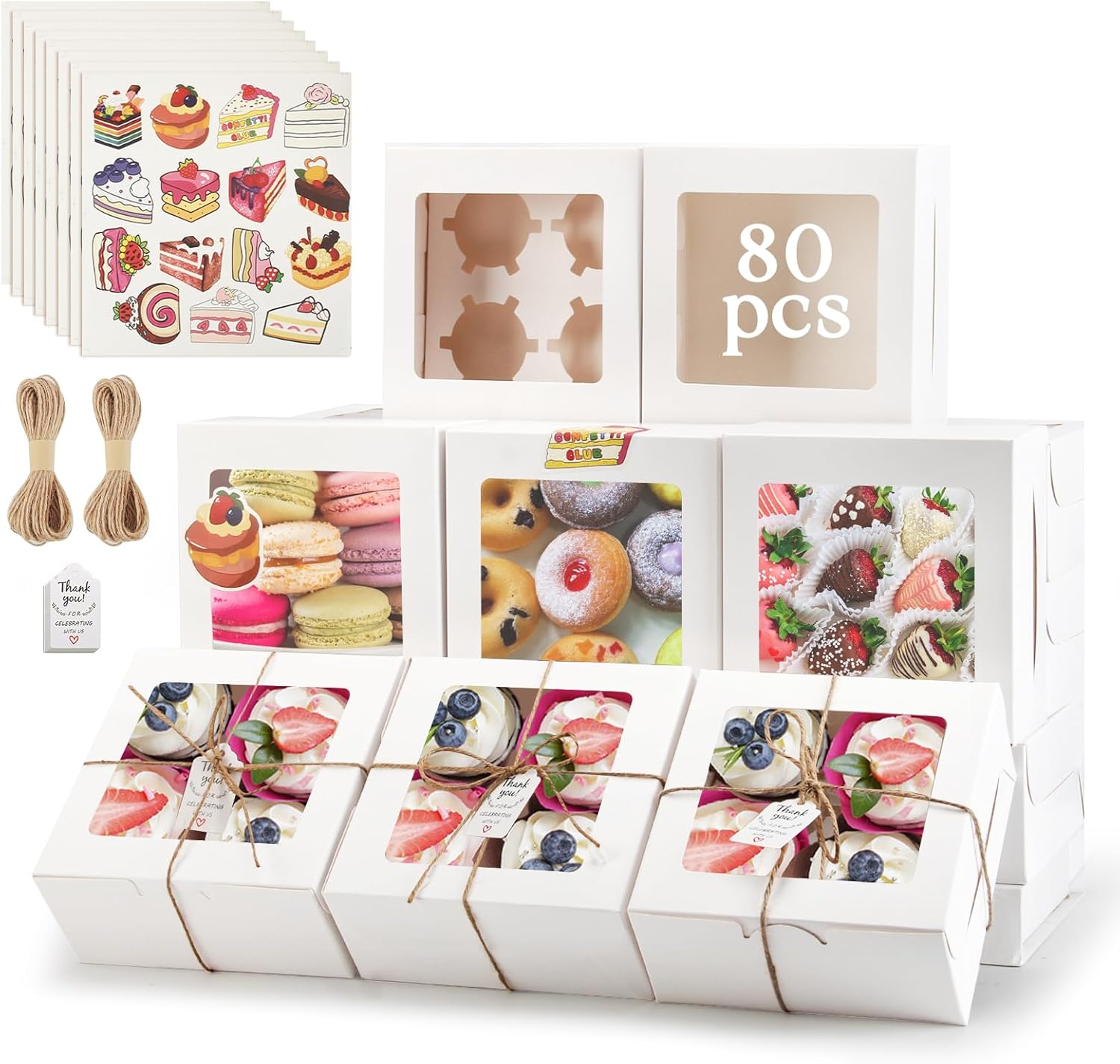OAMCEG 80 Pack Cookie Boxes with Window 6x6x3 Inches White Cupcake Boxes, Bakery Treat Boxes with Stickers & Twine for Pastry, Desserts, Strawberries, Cupcakes, Gift Giving