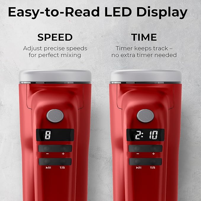 - 9-SPEED CONTROL WITH BUILT-IN TIMER - Adjust between 9 speeds for perfect consistency with every recipe. Stellagro electric hand held mixer has built-in timer that allows control the exact mixing duration, ensuring each ingredient is mixed to the ideal consistency.