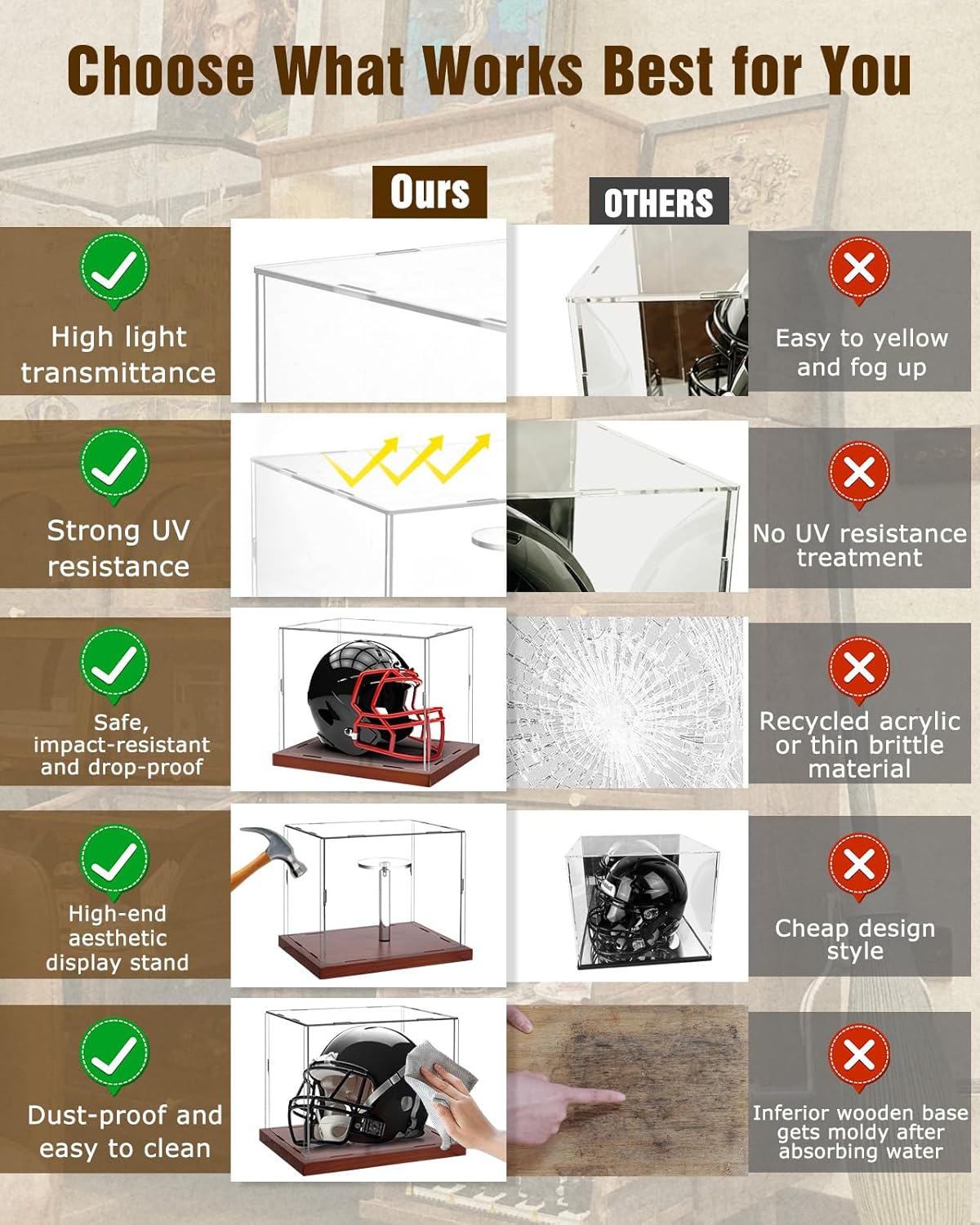 Mini Helmet Display Case - 7.1×5.3×5.9in Interior, 100% Wooden Base, Fits Football/Baseball Mini Helmets & Collectibles, High-Transparency Acrylic with UV Protection