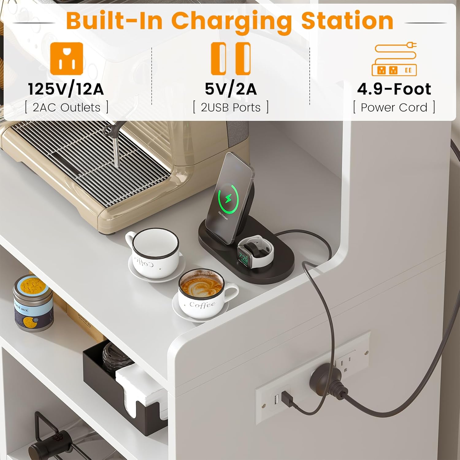 - 【Built-In Charging Station】There are 2 AC outlets and 2 USB ports on the left, and a 4.9-foot power cord, to charge your devices and keep them within reach. The coffee bar comes with the RGB LED light strip, remote control via APP, Over 60000 colors and 29 flashing modes for your to choose.