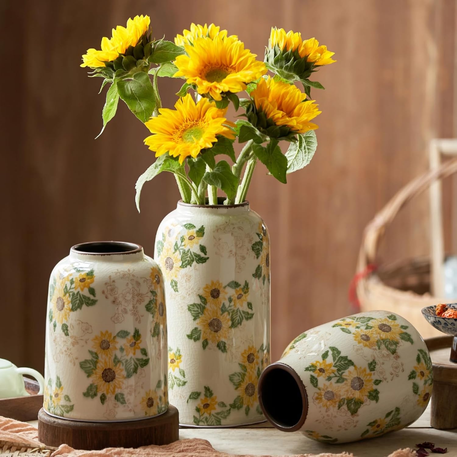 Vintage Ceramic Vase, 10.6 Inch Chinoiserie Sunflower Yellow Floral Vases, Retro Ice Cracked Rustic Antique Flower Vases for Modern Room Bathroom Shelf Home Decor (Large Cylinder)