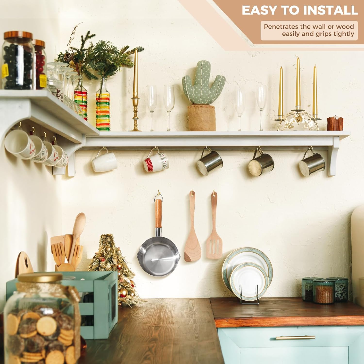 - Wide Application: Cup hooks screw in works for hanging items and organizing space, reduce clutter around the house, like kitchen, cabinet, closet, frame, fireplace, porch, fence, pergola, gutter, patio, garden, garage, office, camper; simple hooks for random items, meet different hanging needs