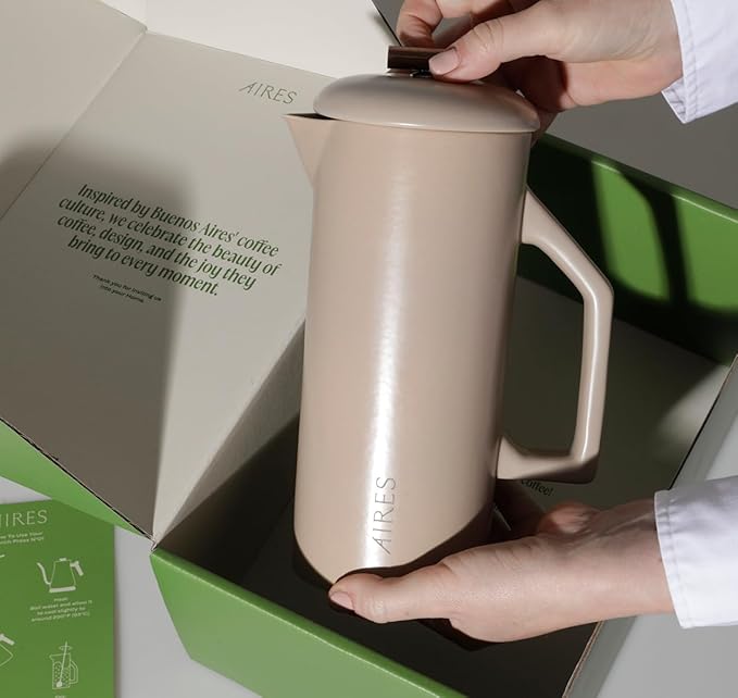 AIRES Ceramic French Press Coffee Maker – 34 oz Heat-Retaining Stoneware – Elegant Neutral Color – Inspired by Buenos Aires Coffee Culture – Gift-Ready with Barista Brewing Guide