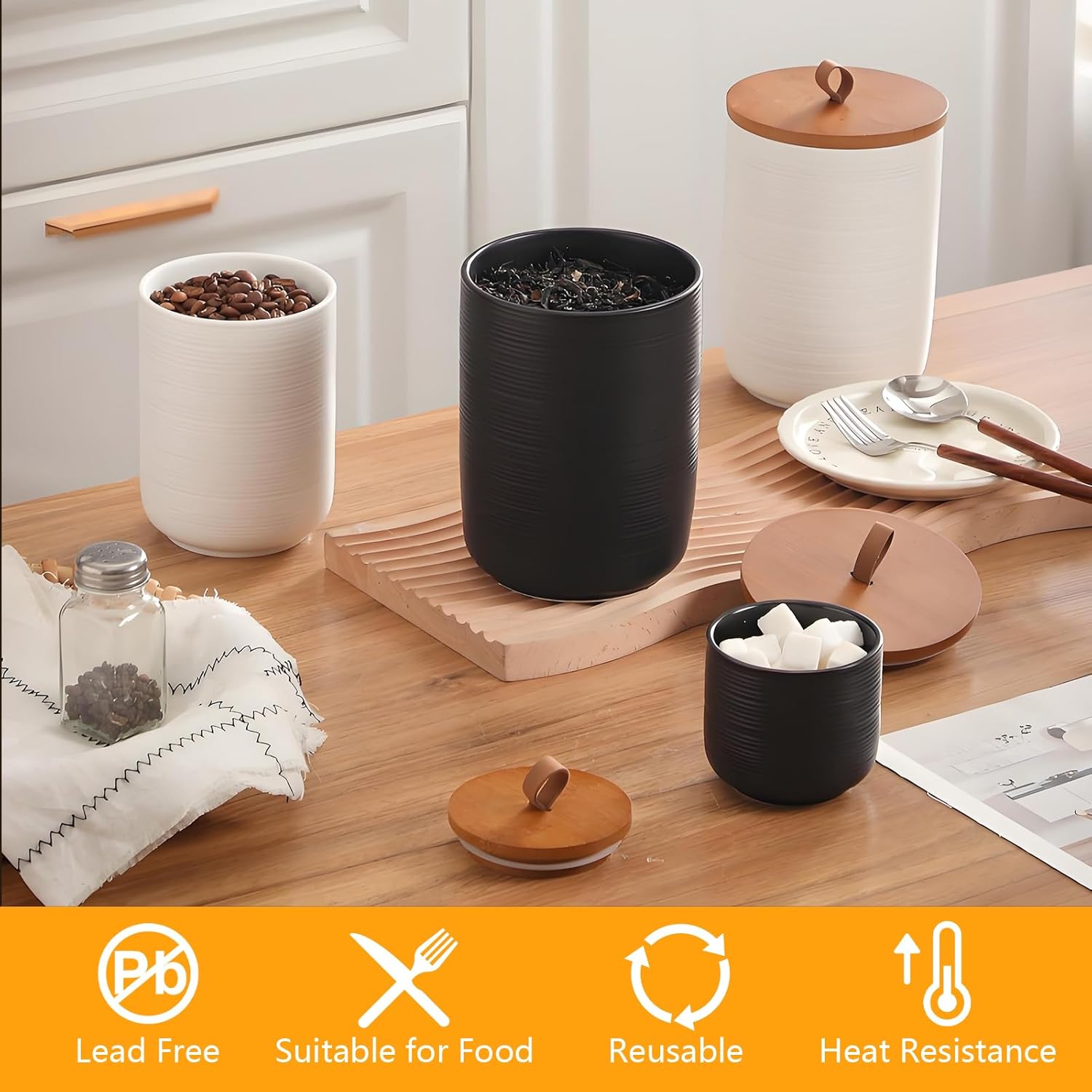 - 【Versatile Storage】With an elegant yet practical style and robust, contemporary design elements, these storage solutions seamlessly complement various kitchen tools, cupboards, and dining tables. Ceramic containers are ideal for organizing a wide range of food items, including tea, coffee, jams, nuts, snacks, baking essentials, and cereal, helping you create a more orderly and clutter-free home environment