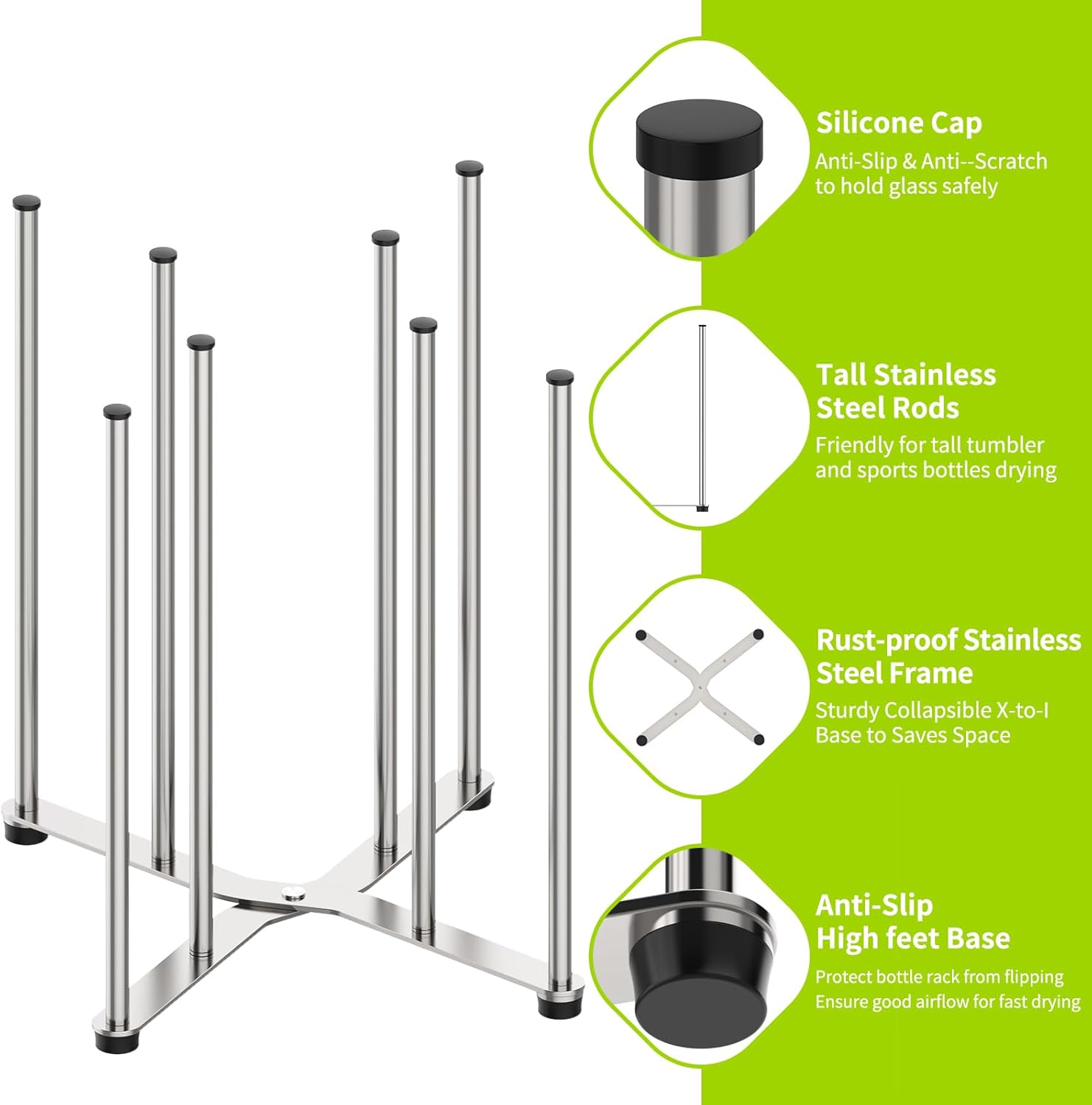 - ăNon-Slip & Scratch-Free Protectionă: Features protective silicone cap on every rod. Securely holds bottles, glassware, and delicate items like wine botttles and decanters upright without wobbling, preventing drinkware from scratches and slips.
