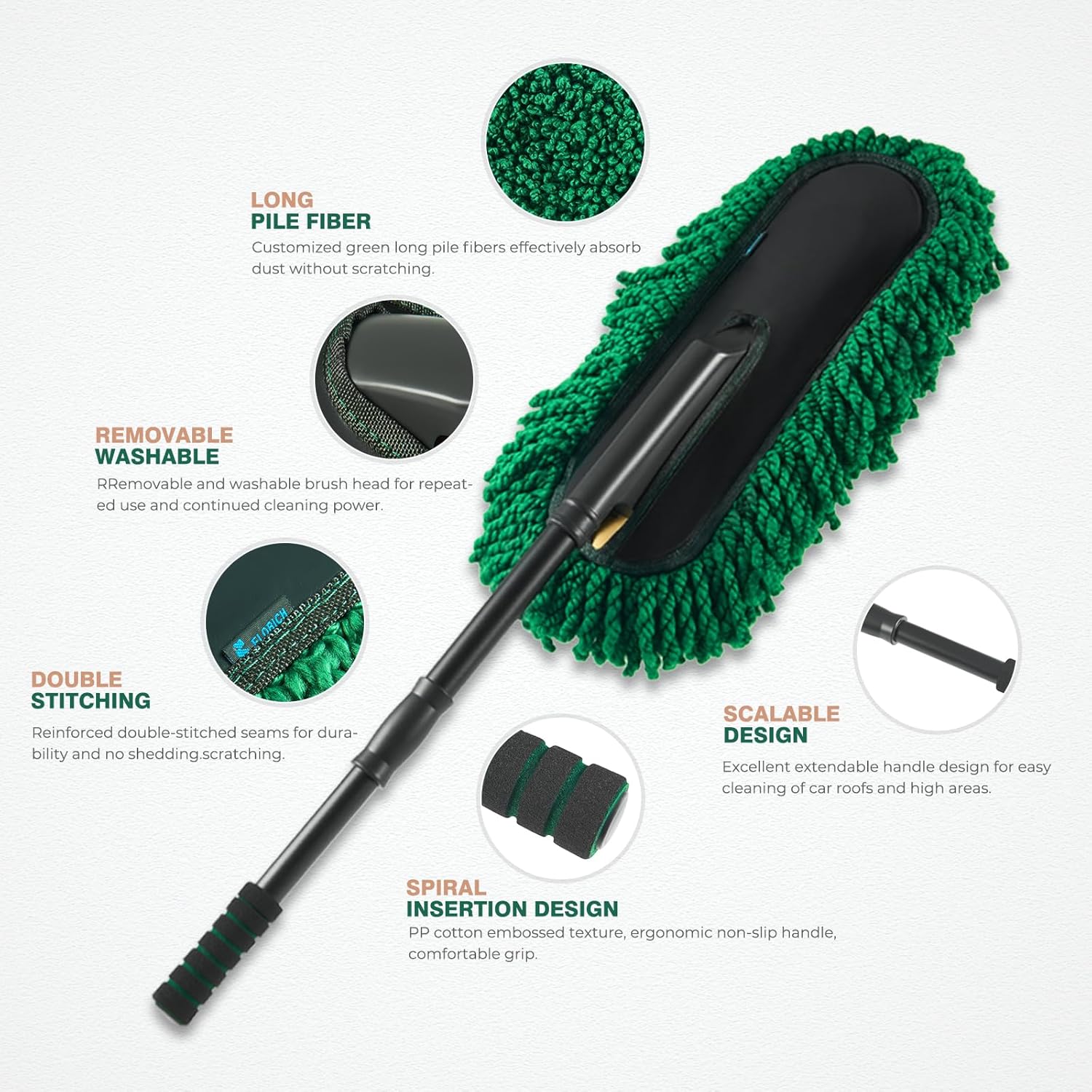 - ALL-IN-ONE CLEANING KIT: This car cleaning duster set is an essential choice for both vehicle and home cleaning. The kit includes: The large telescopic dusting brush for quick and easy cleaning of large areas inside and outside your vehicle. The compact 30cm dusting brush designed for detailed cleaning in tight spaces, ensuring your car stays spotless. Car duster kit is very suitable for trucks, buses, SUVs, RVs and home use.