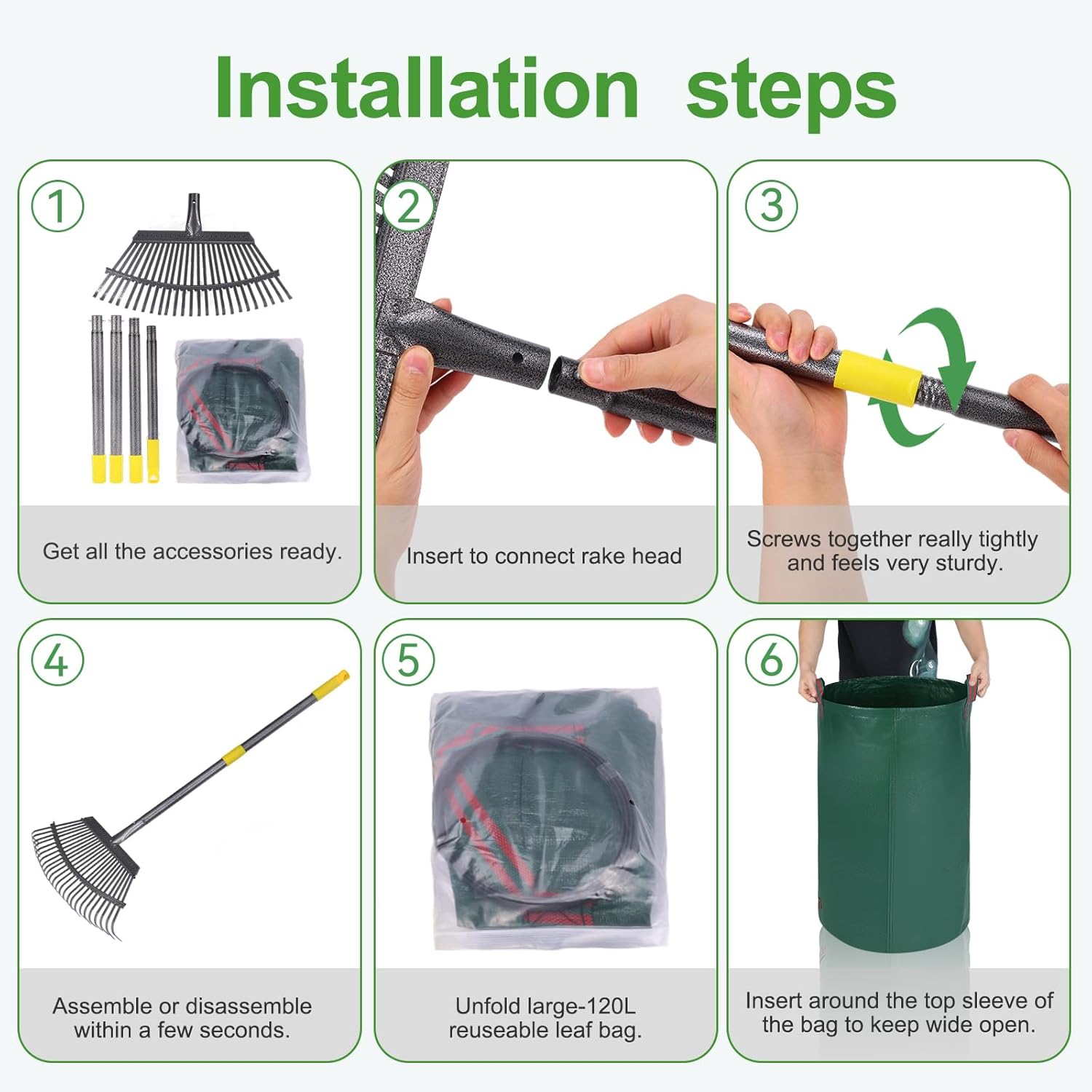 - A Great Cleanup Set for Garden: Include Rake & 32-gallon reusable leaf bag. 25 Tines rake head for large area makes for quick work. This yard waste bag made of thick and waterproof tarp material—spacious when unfolded. A belt-like rigid strip keeps the top open. Sturdy and large-capacity bag make it easy to collect leaves, grass, etc.